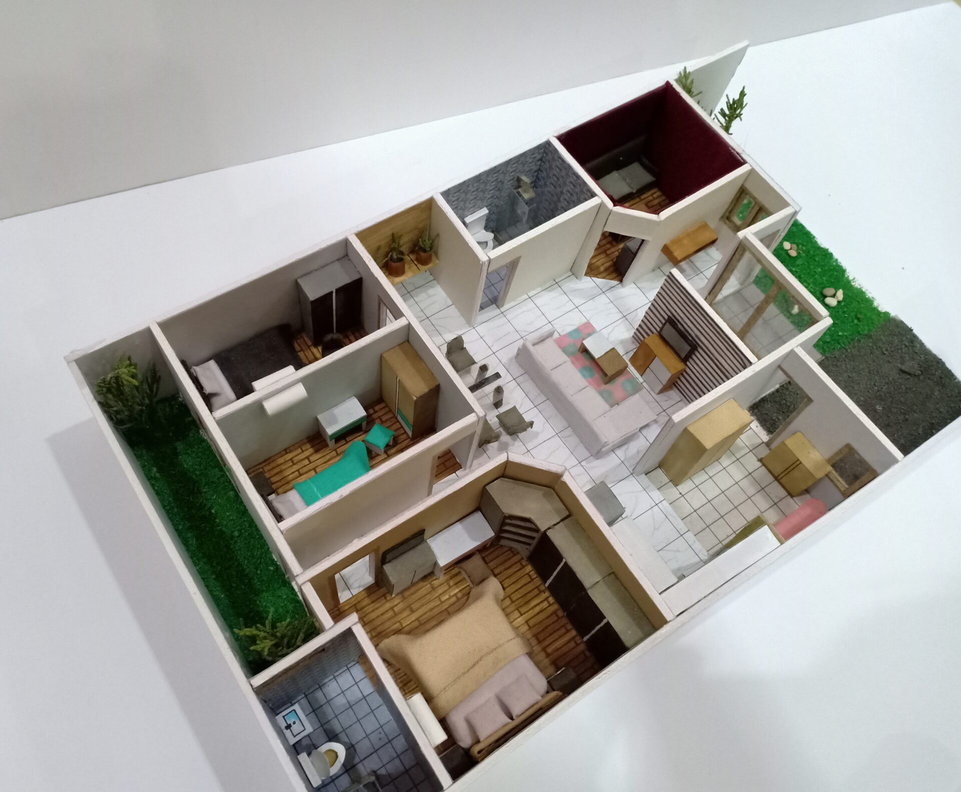 Color scheme yang saya gunakan dominan dengan warna coklat, karena banyaknya pemakaian material kayu. Selain itu saya juga menggunakan warna broken white, navy blue, mint, hitam, abu, dan maroon. Untuk material lantai,saya banyak menggunakan keramik serta vinyl.