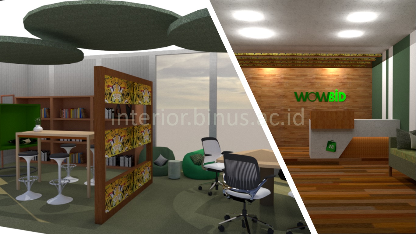 Pengaplikasian konsep Sustainable diterapkan dalam segi material yang recyclable dan long-lasting yang digunakan sebagai bahan furniture dalam ruangan, dan pemilihan color palette yang digunakan untuk menciptakan kesan dari kearifan local dan mencerminkan karakteristik dari perusahaan itu sendiri. Perancangan office ini diharapkan memberikan kesan Future Sustainable dengan menonjolkan warna, material dan kearifan local batik untuk Office WOWBID dalam bidang e-commerce.