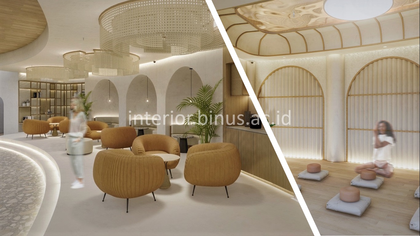 Sebagai pengaplikasian konsep pada desain, sirkulasi berdasarkan zona dibuat satu jalur dan di setiap lantai terdapat resepsionis agar keprivasian pengguna bisa terjaga. Selain itu ambience pada setiap area dibuat tenang dan teduh agar dapat mereduksi tingkat stress serta kapasitas ruang yoga dan ruang meditasi dibuat tidak terlalu banyak agar kegiatan tetap berjalan kondusif dan dapat menambah konsentrasi. Yang terakhir, konsep-konsep sustainable diterapkan dari material-material yang digunakan seperti batu alam, kayu, concrete, rotan dan bambu. Secara tidak langsug material tersebut dapat membantu tercapainya ambience yang diinginkan karena warna-warna yang dihasilkan merupakan warna“earth tone”. Dengan konsep interior yang bisa memberikan suasana nyaman dan menenangkan, diharapkan Wellness Center ini bisa menjadi pilihan masyarakat untuk memperbaiki gaya hidup dan juga menghilangkan stress.