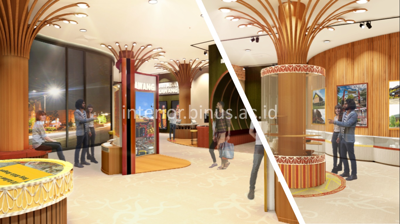 Penerapan konsep pada interior diaplikasikan pada tiap kolom yang merupakan bentuk dari proses pertumbuhan tunas bambu yang melengkung, gate entrance menuju multimedia, galeri dan kafetaria yang terinspirasi dari gerbang China, sofa berbentuk kipas, sirkulasi dan partisi yang melengkung, simplify karpet dari Tidayu, serta warna aksen merah dan kuning sebagai representative dari 3 etnis.