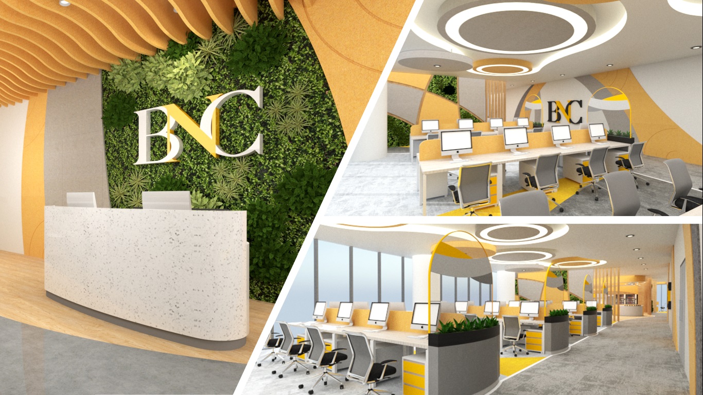 Mengangkat konsep “Exuberant Working Space”, yang dimana “Exuberant” memiliki arti cheerful, vibrant, healthy, dan refreshing. Hal-hal tersebut merupakan sifat yang ingin ditonjolkan ke dalam desain office BNC. Menciptakan area kerja yang cheerful dan fresh dengan menggunakan perpaduan warna kuning, putih, dan abu-abu, yang dimana warna tersebut juga merupakan warna dari logo BNC.