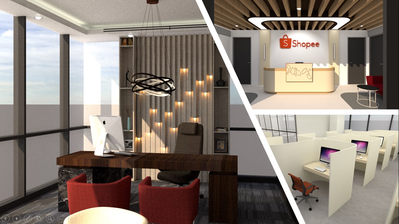 Shopee merupakan e-commerce online shopping yang artinya adalah sangat cepat berkembang terutama pada era digital ini. Melalui studi bentuk dari logo Shopee sendiri, bentuk yang dihasilkan adalah bentuk yang simple, lengkungan minim, seimbang dan simetris. Maka, konsep dari interior kantor Shopee adalah bentuk yang dinamis, memancarkan semangat, area kerja yang produktif, serta berbagai elemen interior yang simple.