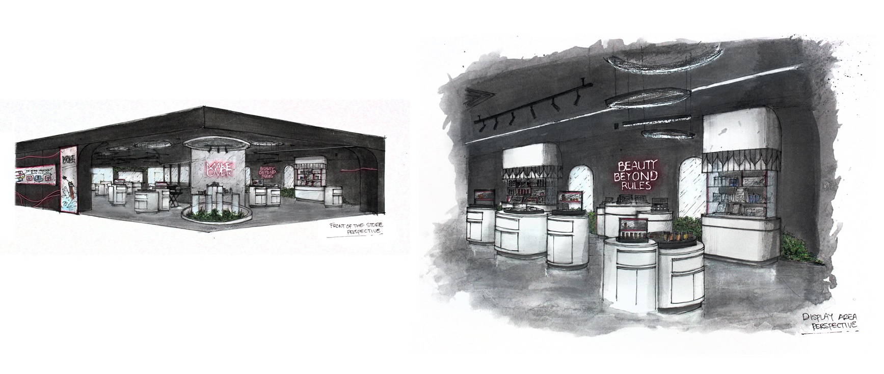 Elegan dan futuristik menjadi konsep yang terpilih karena selaras dengan kesan dan karakteristik yang dimiliki oleh produk Make Over. Konsep ‘Elegan dan Futuristik’ ini dibawa melalui penggunaan warna dominan black onyx dengan perpaduan warna dark grey, light grey, putih, dan magenta sebagai warna aksen yang merepresentasikan ciri khas dari Make Over. Dari segi penggunaan bentuk, sebagian besar menggunakan bentuk melengkung yang tegas dan dominan lingkaran baik pada bentuk furnitur, dinding, sambungan antara dinding dengan ceiling, dan sebagainya untuk memberikan kesan dinamis yang elegan.