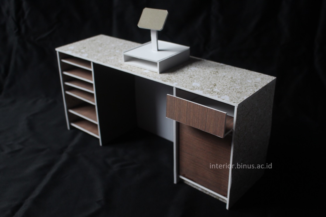 Bentuk yang digunakan yaitu bentuk-bentuk geometri, dengan warna limestone pada top table, warna dark grey pada body, dan finishing panel teakwood pada bagian depan serta rak dibagian belakang. Tekstur pada granit dibuat glossy, pada body table finishing matte, dan terdapat tekstur dari teakwood sendiri. Material terdiri dari granit berwarna limestone pada bagian top table dan kaki, plywood yang dilapisi hpl berwarna dark grey pada body meja, serta teakwood pada aksen panel pada bagian depan dan juga rak / lemari di bagian dalam. Terdapat juga lampu di bagian bawah top table. Lampu yang terdapat di bagian bawah top table tidak terlalu terang, memberi highlight pada panel kayu dan juga body table.
