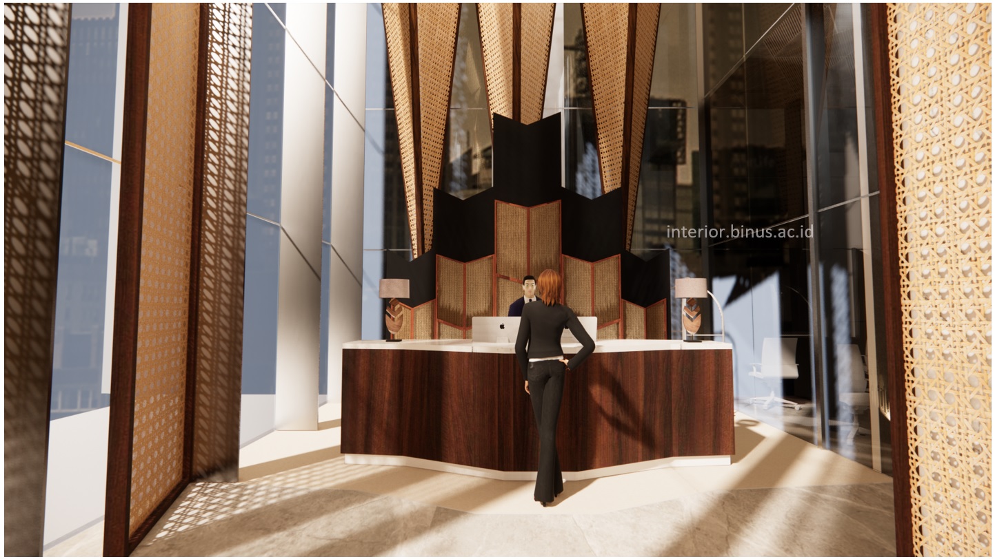 Penerapan bentuk dan warna konsisten digunakan dalam setiap ruangan. Pada awal memasuki hotel, kita akan bertemu dengan berbagai bentuk segitiga yang mendominasi dari finishing dinding dan ceiling. Ciri khas dari konsep dapat terlihat dari penutup sirip di dalam ruangan yang berbentuk segitiga. Pentup sirip memiliki pola dan bentuk berlubang dan merupakan anyaman. Fungsinya untuk meminimalisir cahaya yang masuk ke dalam ruangan sehingga ruangan terasa lebih nyaman dan sejuk. Tidak hanya itu, pengaplikasian beberapa sun shading yang berbentuk segitiga digunakan di beberapa area lainnya, yaitu area restaurant, dan area bar.