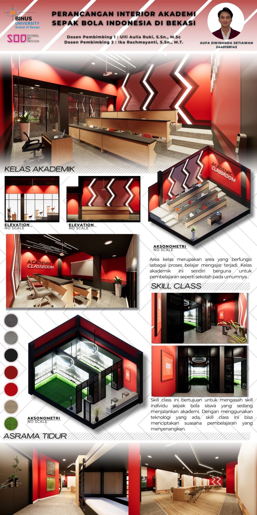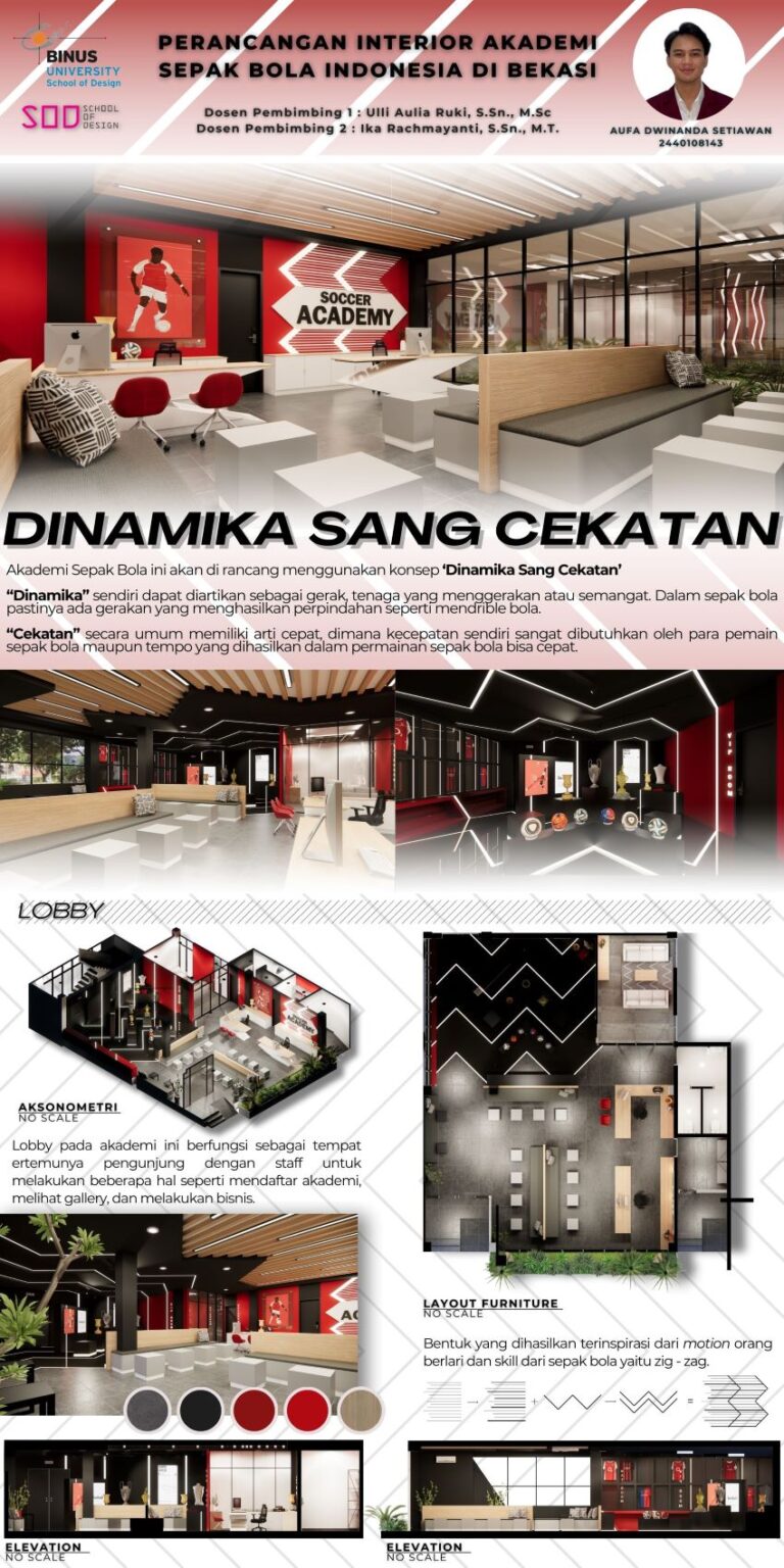 Perancangan akademi ini akan menggunakan konsep ”Dinamika Sang Cekatan” yang diambil dari karakteristik permainan sepak bola. “Dinamika” sendiri dapat diartikan sebagai gerak, tenaga yang menggerakan atau semangat. Sementara kata “Cekatan” secara umum memiliki arti cepat, dimana kecepatan sendiri sangat dibutuhkan oleh para pemain sepak. Hasil yang dikeluarkan dari kata ”Dinamika Sang Cekatan” bentuknya seperti motion orang berlari dan terlihat seperti bergradasi yang menimbulkan efek seperti bergerak. Perancangan akademi ini akan dirancang dengan menerapkan teknologi interaktif yang dapat membantu meningkatkan individu dari pemain. Warna yang akan digunakan juga warna yang memberikan kesan gembira, kekuatan, dan semangat, serta warna yang identik dengan Indonesia. Akademi ini juga dirancang agar kebutuhan fasilitasnya dapat terpenuhi dan lengkap. |