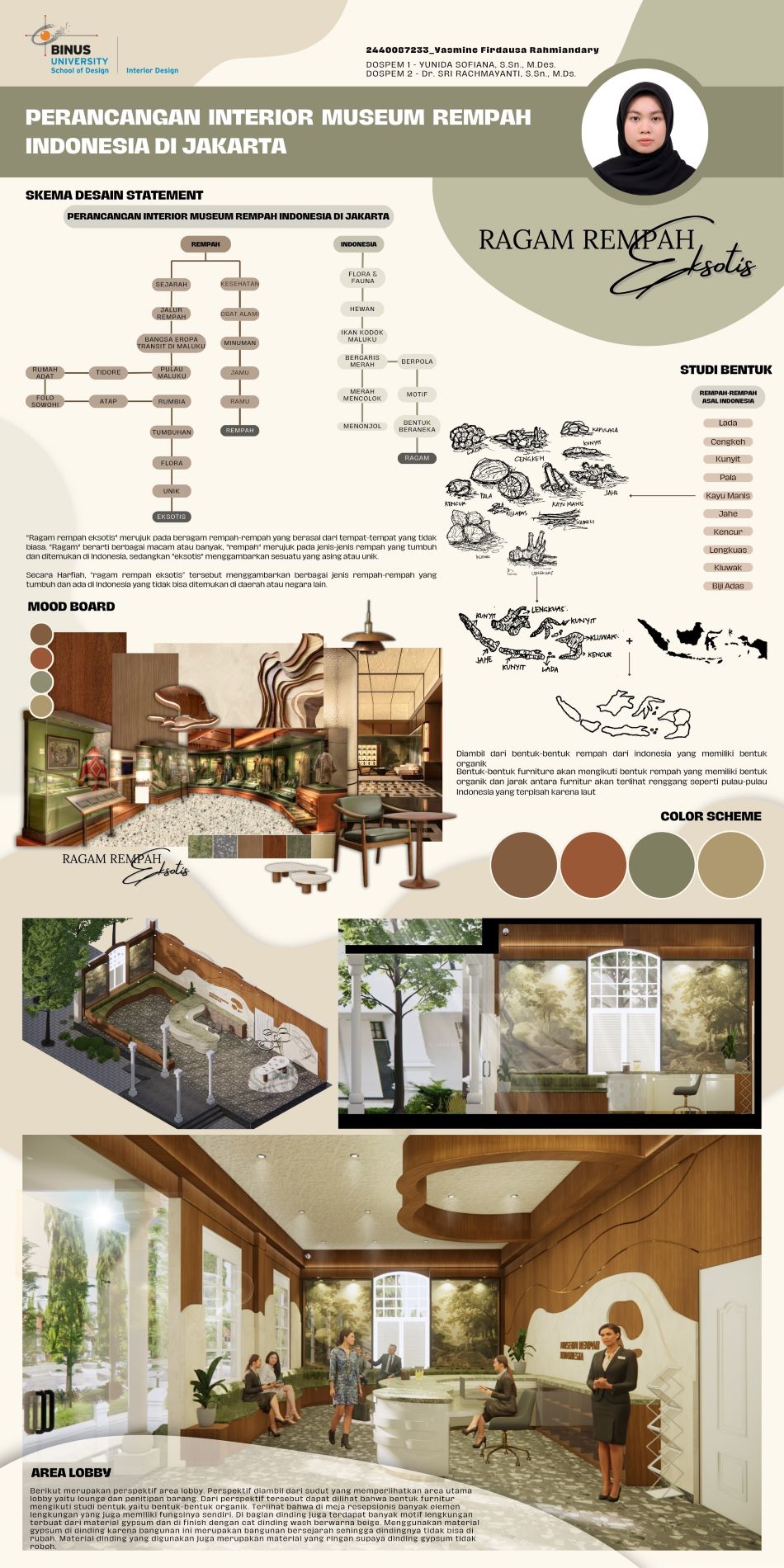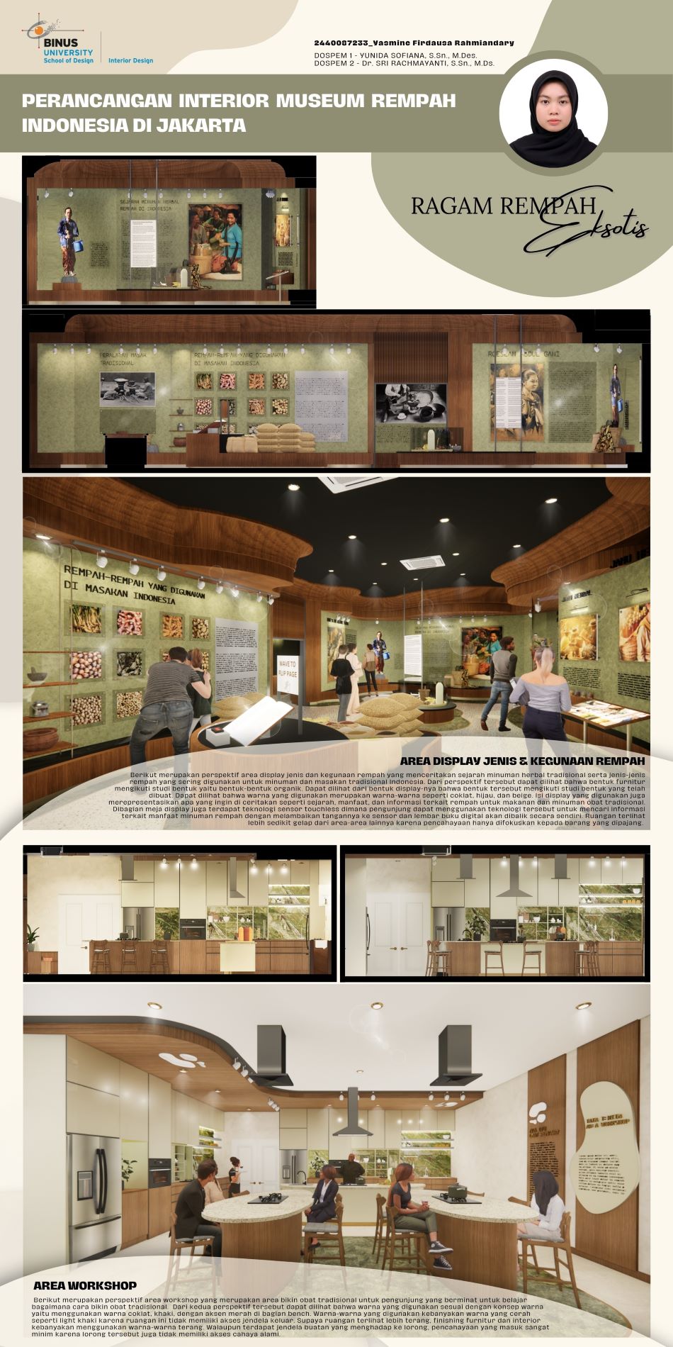 | Perancangan Interior Museum Rempah Indonesia di Jakarta ini ingin memperkenalkan asal-muasal perdagangan, dan peranan politik rempah sangat penting dalam sejarah kemerdekaan Indonesia. Sejak dimulainya rempah sebagai komoditi strategis Indonesia, maka dimulai juga tentunya era rempah memproduksinya dari hulu ke hilir sampai kepada warga Indonesia. masyarakat serta sejarah, jenis, dan manfaat praktek-praktek tradisional yang diterapkan dalam kehidupan sehari-hari masyarakat Indonesia. Alur cerita yang ingin disampaikan dimulai dari sejarah rempah di Indonesia, jenis-jenis rempah asal Indonesia, jenis rempah yang digunakan untuk makanan, bertema “Ragam Rempah Eksotis”.