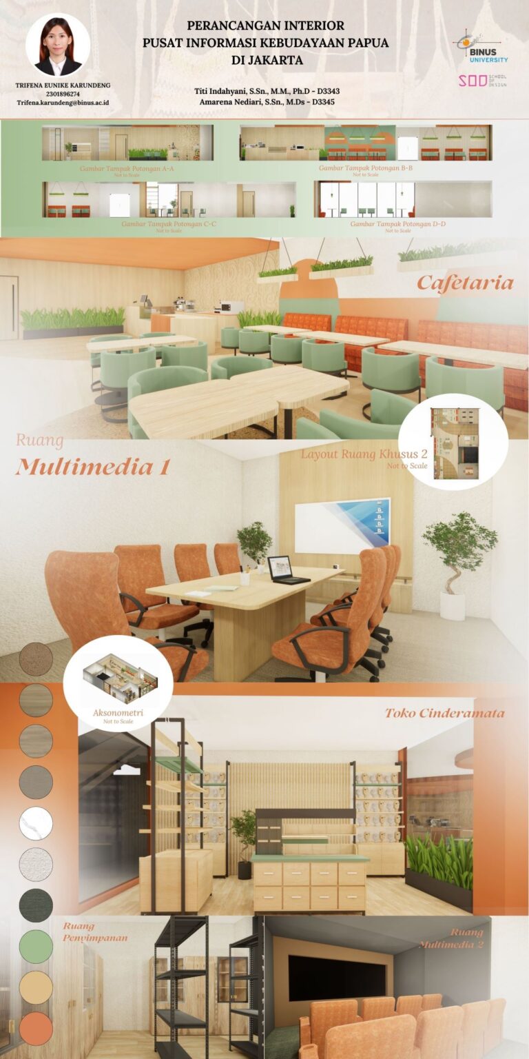 Pusat Informasi Kebudayaan Papua ini dirancang untuk menampilkan berbagai karya seni Papua dari berbagai sektor. Ruang-ruangnya juga dilengkapi dengan fasilitas yang memadai untuk mendukung kegiatan edukasi dan apresiasi budaya Papua. Dinding dan langit-langit ruangan dihiasi dengan motif-motif tradisional yang menggambarkan kekayaan seni dan budaya Papua. Penggunaan bahan-bahan alami tidak hanya memperkuat koneksi dengan alam, tetapi juga mencerminkan kearifan lokal Papua dan keberlanjutan lingkungan atau sustainable. Area display dibuat interaktif dengan menampilkan artefak-artefak budaya yang penting, memberikan pengalaman belajar yang menarik dan mendalam bagi pengunjung. Harapan dari perancangan Pusat Informasi Kebudayaan Papua ini adalah untuk menjadi wadah bagi generasi sekarang dan masa depan agar memiliki semangat yang tinggi dalam mempelajari dan melestarikan kebudayaan Papua. Dengan fasilitas yang lengkap, pusat ini diharapkan dapat mencegah kepunahan budaya dan menginspirasi kebanggaan akan warisan budaya Papua. |