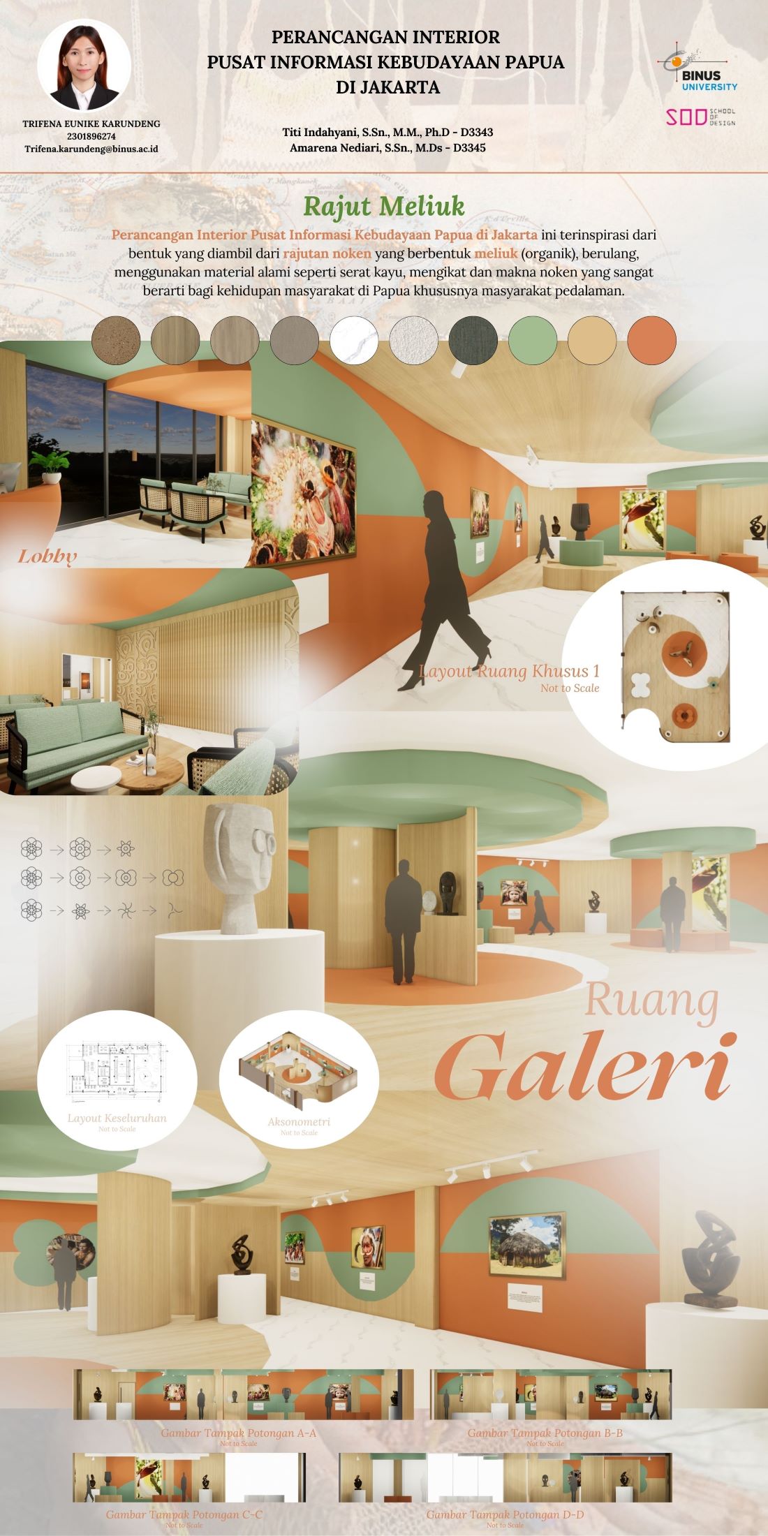 | Perancangan Interior Pusat Informasi Kebudayaan Papua di Jakarta ini terinspirasi dari bentuk organik yang diambil dari rajutan pada noken. Noken merupakan tas tradisional Papua yang berfungsi dan begitu penting dalam kehidupan masyarakat Papua, terutama masyarakat yang tinggal di pedalaman. Noken melambangkan kehidupan. Bentuk meliuk dan berulang dari rajutan noken diadaptasi dalam desain interior dengan menggunakan material alami seperti serat kayu dan kayu yang menciptakan kesan yang hangat dan autentik.