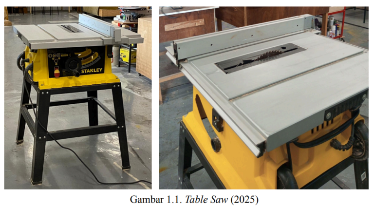 Table Saw atau yang dapat disebut dengan Mesin Gergaji Meja merupakan mesin gergaji yang mampu memotong kayu dengan permukaan yang lebih luas. Hal ini dikarenakan adanya meja built-in di atas mesin gergaji dengan bidang yang terbuka dengan luas, memudahkan pemotongan kayu yang memiliki ukuran lebih dari 60 cm. Akan tetapi, kekurangan dari table saw adalah tidak adanya stopper yang dapat berbahaya apabila tidak dapat mengontrol grip perkayuan. Cara menggunakan mesin table saw memiliki tahap dengan dimulainya menyalakan mesin – meletakkan ujung kayu di atas meja dengan menempelkan permukaan kayu yang ingin digunakan ke arah bantuan sisi samping adjuster – lalu mendorong kayu ke arah depan mesin gergaji (yang mana jika permukaan kayu sudah mendekati mesin gergaji, alat bantu dorong dapat digunakan untuk mendorong sisa kayu yang sudah dekat dengan mata pisau secara aman agar tidak membahayakan tangan terluka). Berikut di bawah ini gambar yang mendukung cara penggunaan table saw, yang merupakan mesin yang digunakan pada tahap awal membuat kotak tisu: