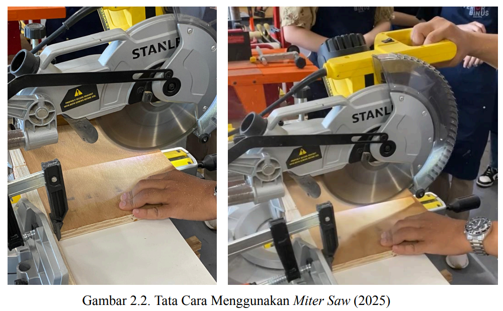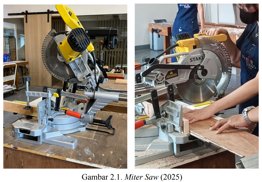 Gambar di atas menunjukkan miter saw yang digunakan di WF (Workshop Furniture)-Anggrek memiliki fungsi lampu sebagai alat bantu marking untuk mengetahui batas permukaan area yang dipotong. Namun pada umumnya, setiap miter saw sendiri memiliki fungsi demikian yang terdiri dari dua macam; yaitu lampu dan laser. Cara memakai alat ini dengan tarik mesin gergaji ke belakang – lalu nyalakan mesin – tekan mesin ke bawah ke permukaan kayu – dan dorong ke depan untuk memotong batasan area permukaan yang dipotong. Akan tetapi, Pak Gayung sendiri menyarankan untuk lebih baik mendorong mesin gergaji ke bawah ke permukaan kayu terlebih dahulu lalu baru nyalakan mesin.