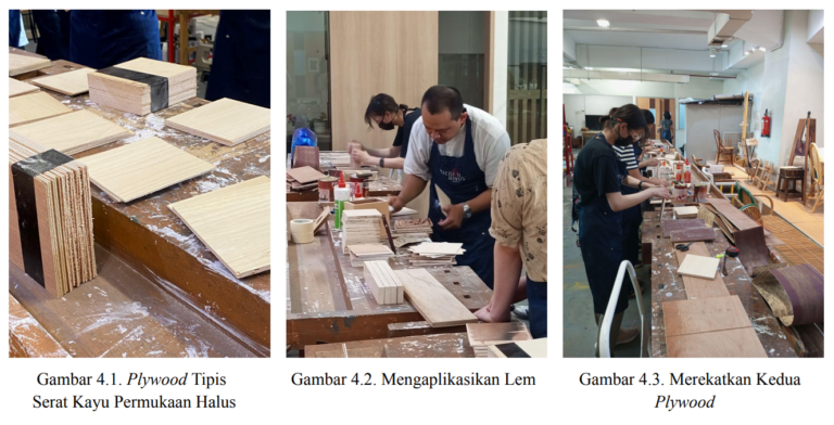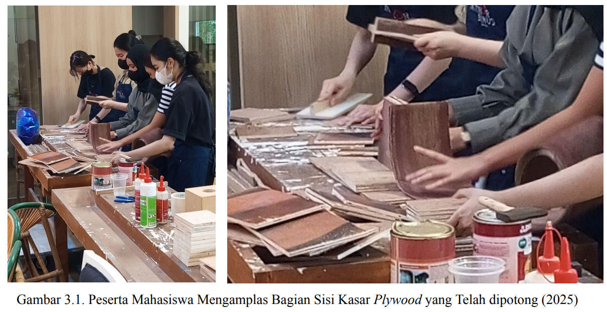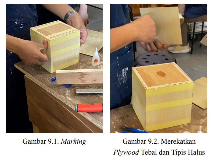 Langkah selanjutnya, peserta mahasiswa melembutkan bagian sisi kasar plywood yang telah dipotong dengan mesin miter saw menjadi 4 bagian dengan menggosok menggunakan amplas, seperti yang dapat dilihat pada gambar di atas. Setelah itu, plywood yang telah di amplas direkatkan dengan plywood ketebalan tipis yang memiliki permukaan lebih halus dan serat kayu yang cantik untuk memberikan kotak tisu yang kokoh dengan penggunaan plywood tebal di dalam dan plywood tipis di luar sebagai bagian tujuan estetika visual. Perekatan ini dapat menggunakan lem kayu alifatik atau super glue seperti lem Alteco. Tetapi pada kesempatan lokakarya kali ini menggunakan super glue dikarenakan waktu keringnya lebih cepat. Namun, Pak Gayung menyarankan untuk pembuatan perkayuan menggunakan lem kayu alifatik yang memiliki daya rekat yang lebih kuat dan tahan lama. Lem kayu alifatik ini merupakan modifikasi dari lem PVA (Polyvinyl Acetate).