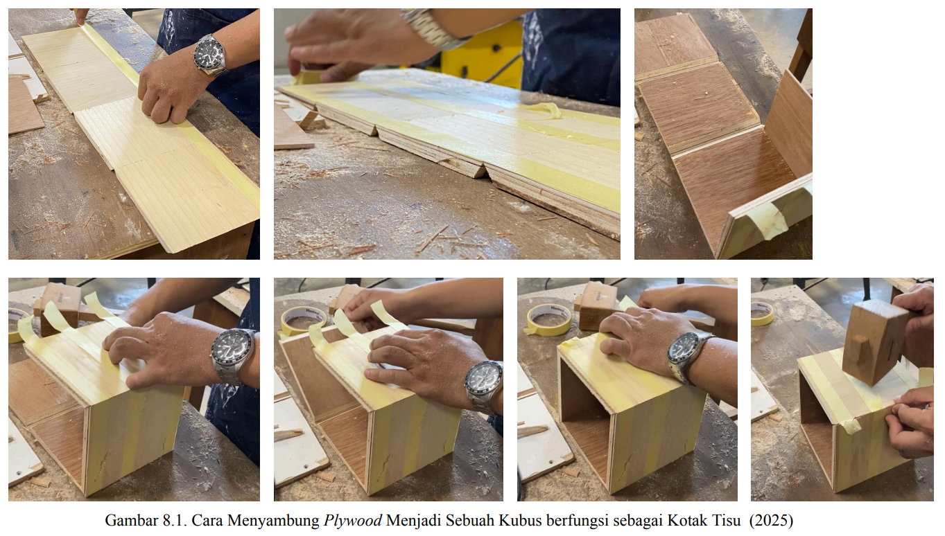 Dapat dilihat dari gambar-gambar diatas menunjukkan cara menyambung plywood menjadi sebuah kubus. Agar sambungan tersambung dengan baik dan kuat, dapat menggunakan palu untuk mendorong mortise tenon joint. Setelah itu setiap sisi bagian dalam kotak direkatkan dengan super glue agar merekat