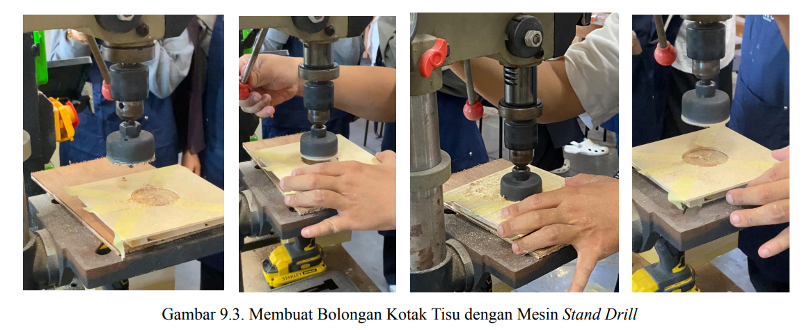 Mesin berikutnya yang digunakan dalam pembuatan kotak tisu ini adalah stand drill atau yang disebut dengan mesin bor duduk. Sebelum menggunakan mesin ini, kubus yang sudah direkatkan memerlukan tutup kotak yang memberikan fungsi mendisplay dan mengambil tisu dari kotak tisu. Tutup kotak ini perlu diukur terlebih dahulu agar ukuran nya sama presisi dengan bolongan kotak yang ada untuk tutup kotak.