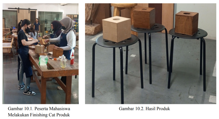 Langkah terakhir dari lokakarya ini adalah finishing produk. Finishing produk ini menggunakan cat vernis kayu berbasis air yang mudah diaplikasikan dan memiliki waktu yang cepat kering.