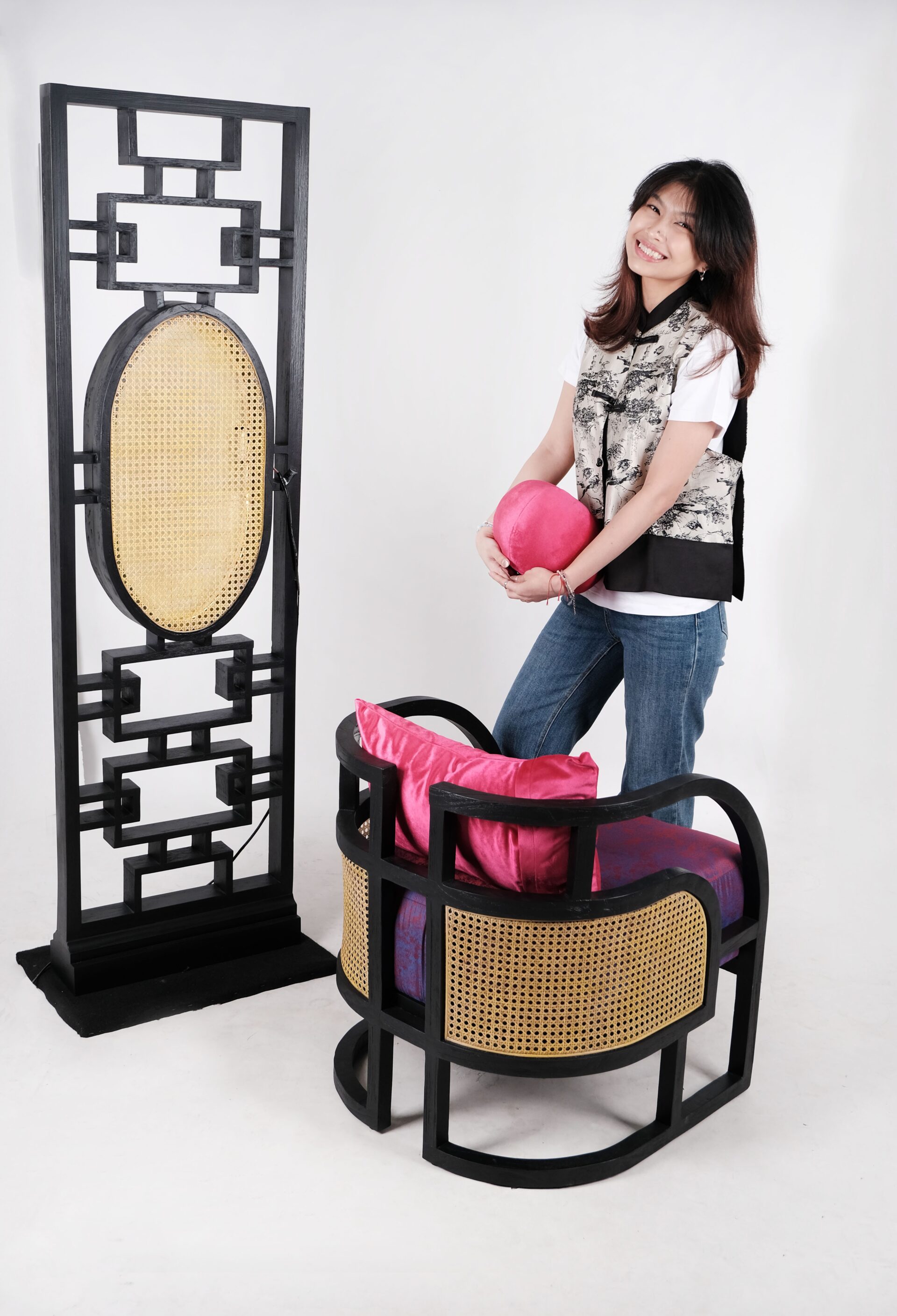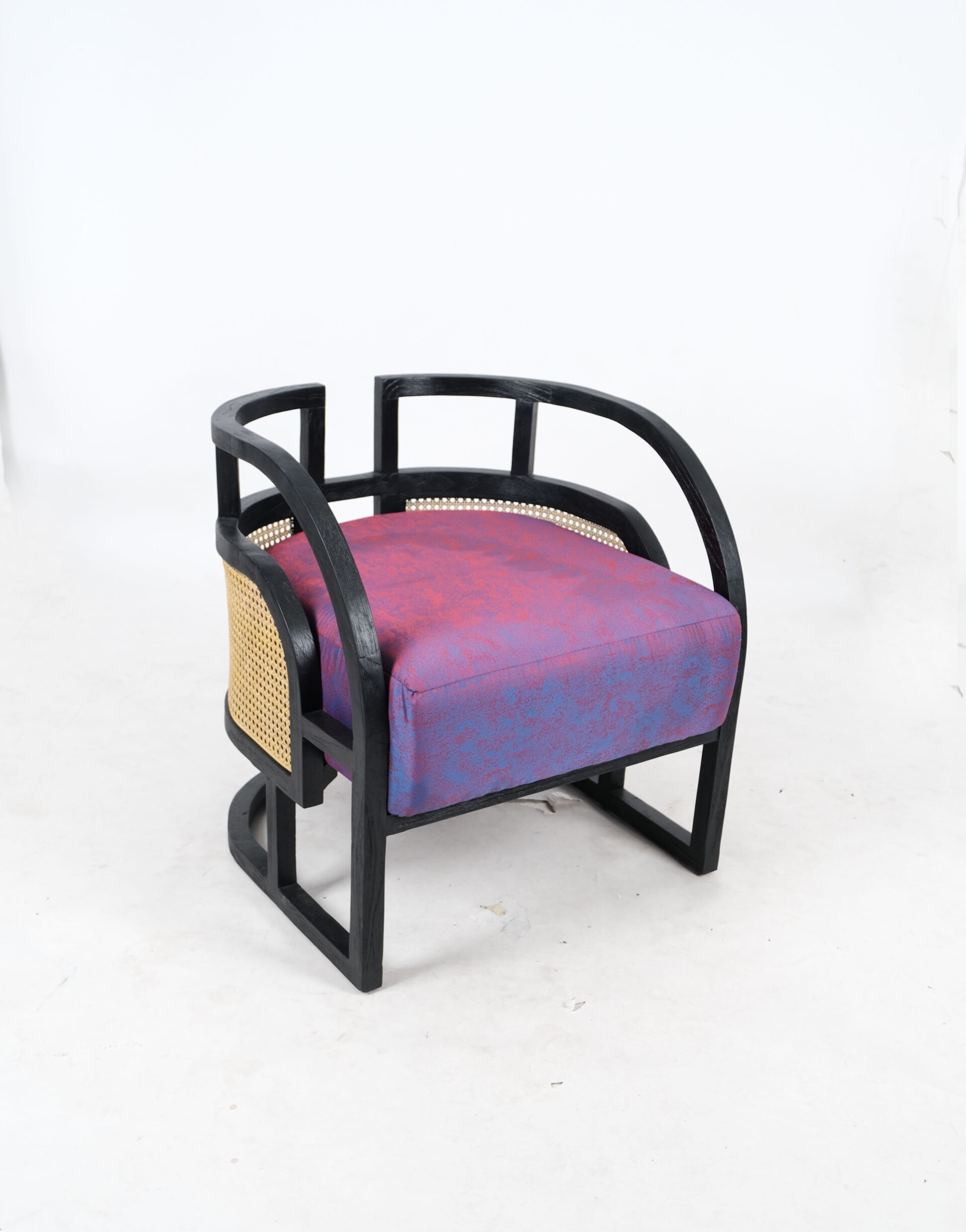 Nama Xíng Yùn berasal dari Mandarin, di mana “形” (Xíng) berarti “bentuk” dan “韵” (Yùn) berarti “keanggunan.” Kursi ini mengusung konsep Geometric Oriental, memadukan bentuk geometris dengan estetika khas Tiongkok dalam tema Modern Chinese. Desain kursi terinspirasi dari motif oriental shou, simbol keberuntungan dan umur panjang. Motif ini hadir dalam lengkungan armrest dan backrest dengan garis saling terhubung. Aksesoris persegi panjang menambah harmoni visual. Cushion berwarna fuchsia, melambangkan keberuntungan, dipadukan dengan aksen emas yang mencerminkan kemewahan, serta hitam untuk keseimbangan. Material utama kursi adalah kayu solid, dibentuk dengan teknik bending untuk lengkungan halus. Sambungan menggunakan dowell joint serta mortise and tenon, menjamin kekuatan struktur. Cushion berbahan fabric dengan rangka multipleks dan webbing memberikan kenyamanan, sedangkan sandaran rotan menambah kesan natural dan mewah. Dirancang dengan prinsip ergonomi dan antropometri, kursi ini memberikan kenyamanan optimal untuk aktivitas singkat di ruang lobby. Dengan perpaduan kekuatan, keanggunan, dan keseimbangan visual, Xíng Yùn menjadi elemen fungsional sekaligus estetis dalam interior Modern Chinese.