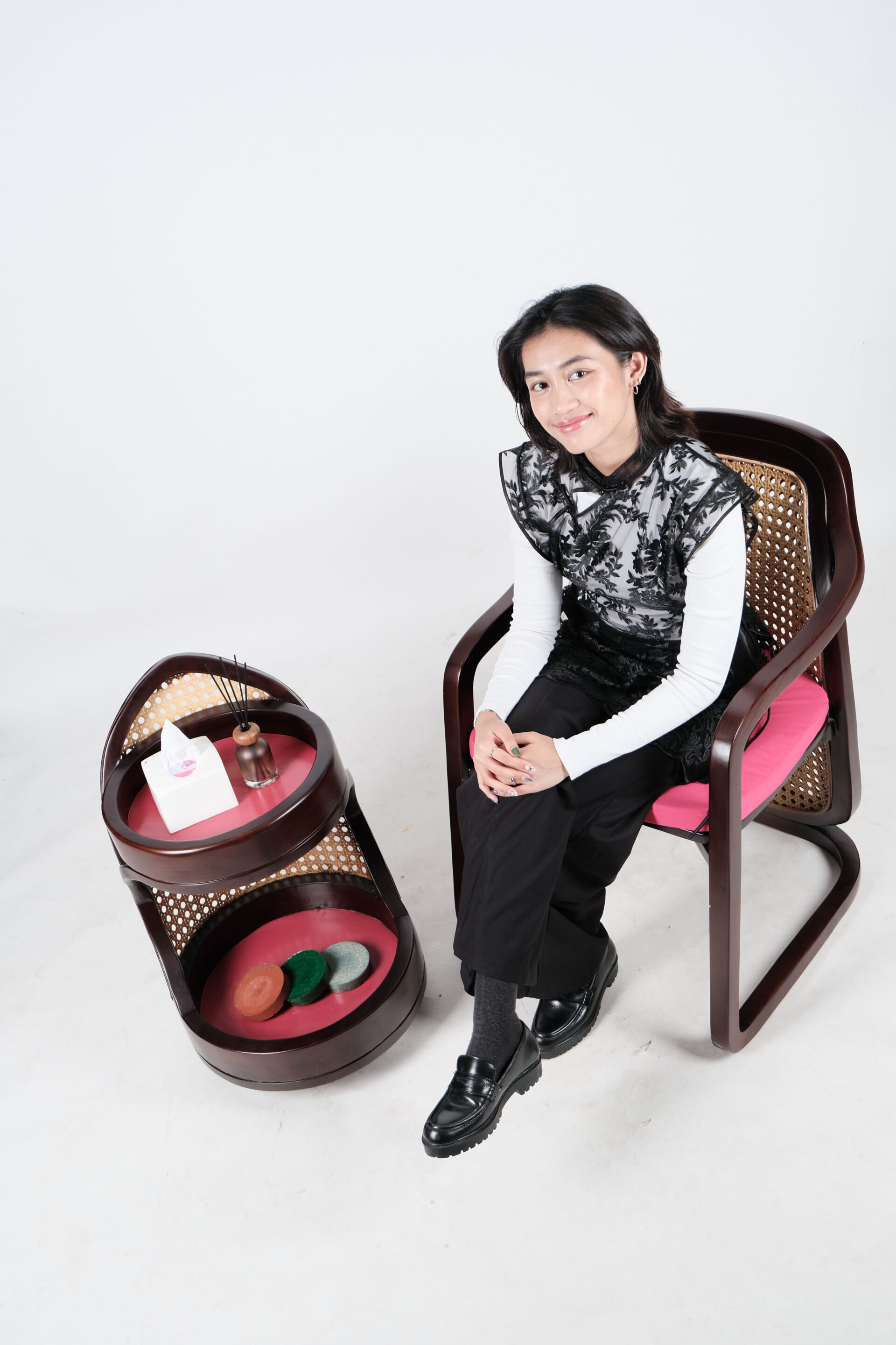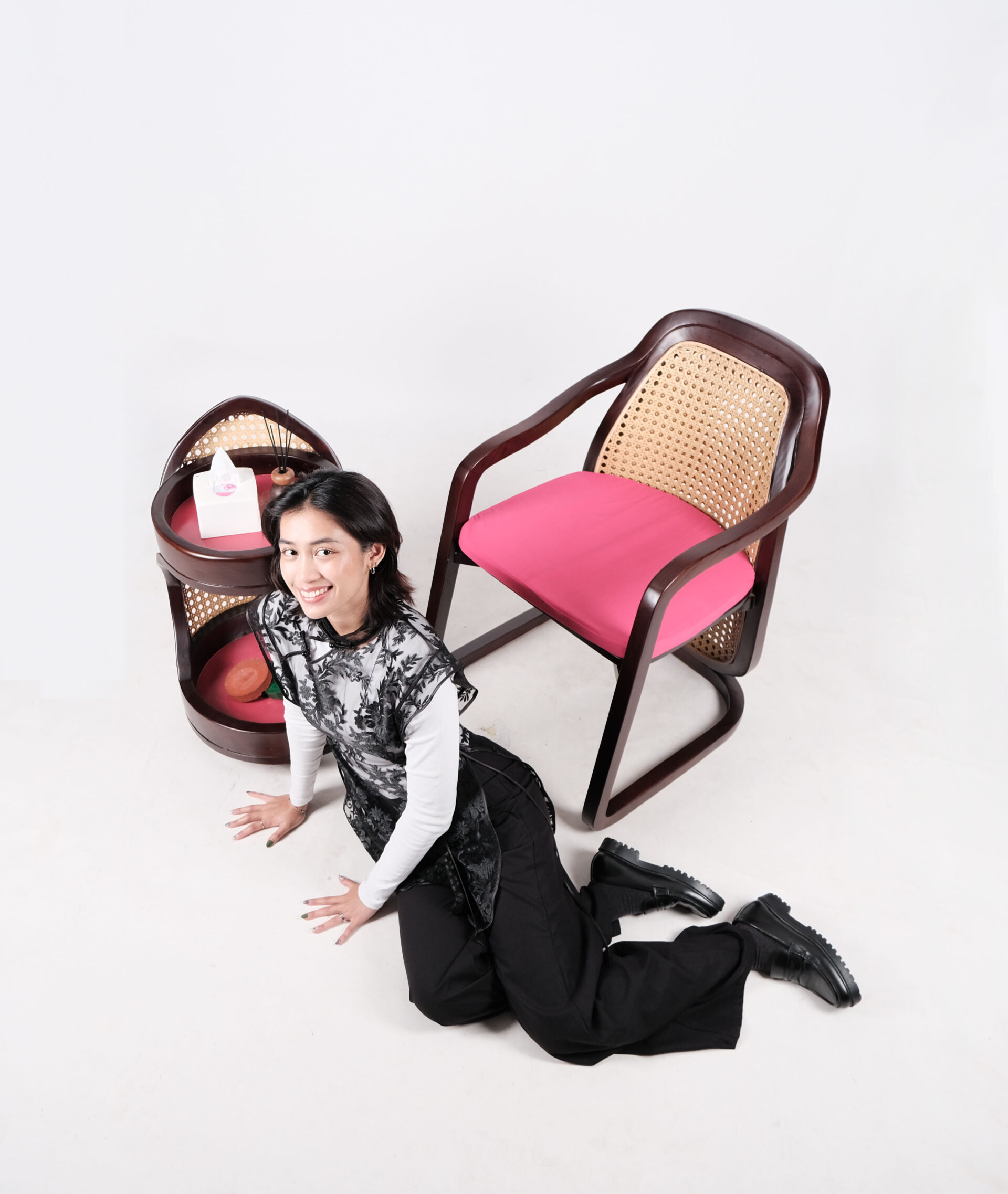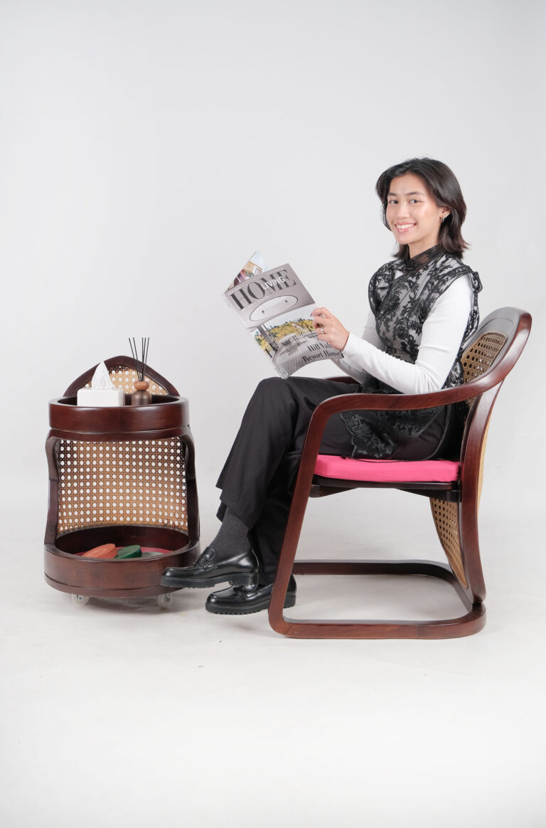 Fu Set terdiri dari Fu Chair dengan material kayu di finishing doff gelap, kursi ini memiliki bentuk seperti aliran air yang selalu menyambung mengibaratkan kekayaan yang terus melipah. Digabungkan dengan warna cushion fushia yang memberi pop of color dan juga material anyaman rotan untuk bagian punggung memberi kesan oriental dan breathable. Di lengkapi dengan Fu Trolly untuk menyimpan asbak dan hiasan kecil untuk pengunjung restoran Hotel Ashley Tang.