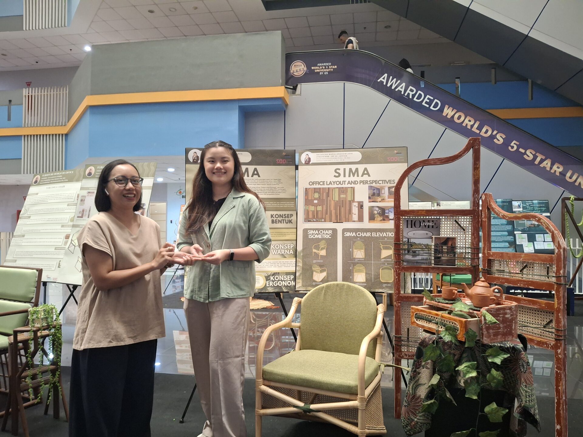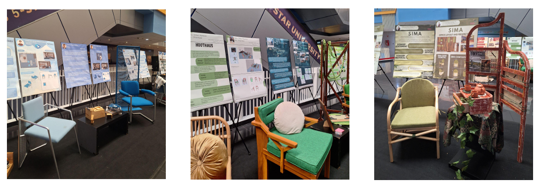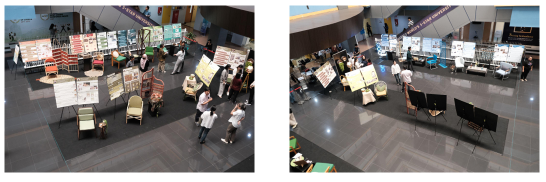 Selanjutnya, dua mahasiswa dari DF 3 Office membagikan pengalaman mereka selama proses pembuatan karya. Mereka menceritakan tantangan dan kebahagiaan yang dirasakan saat mengembangkan ide hingga realisasi, menegaskan bahwa setiap karya adalah hasil dari ketekunan dan dedikasi yang mendalam. Seperti yang diungkapkan oleh salah satu perwakilan mahasiswa, “Proses pembuatan kursi ini penuh tantangan, tapi setiap hambatan membuat kami belajar lebih banyak dan semakin bersemangat untuk menghasilkan karya terbaik.” Rekan satu timnya menambahkan, “Kerja keras dan kolaborasi tim membuat kami bisa melewati suka dan duka, hingga akhirnya karya kami dapat dipamerkan di sini dengan bangga.”