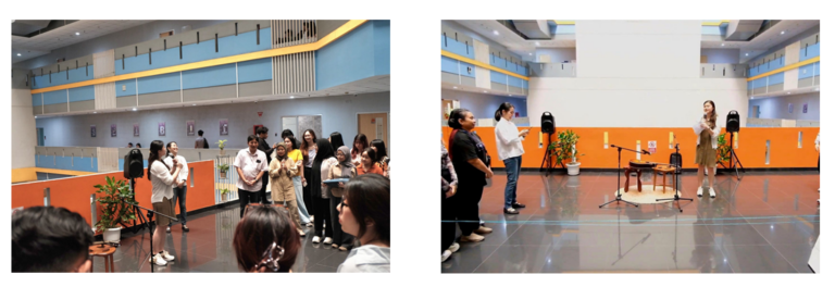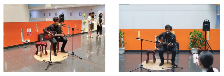 Salah satu momen yang paling mencuri perhatian di awal acara adalah penampilan akustik dari seorang mahasiswa. Dengan suara yang lembut dan permainan gitar yang memukau, ia berhasil menghadirkan suasana yang hangat dan menyentuh. Lagu yang dibawakannya menggema dengan penuh rasa, menciptakan suasana intim yang memperkuat nuansa koneksi dan kenyamanan nilai utama dalam tema pameran. Tepuk tangan meriah dari para dosen dan mahasiswa menjadi bentuk apresiasi atas penampilan pembuka yang begitu mengesankan.