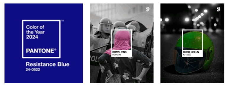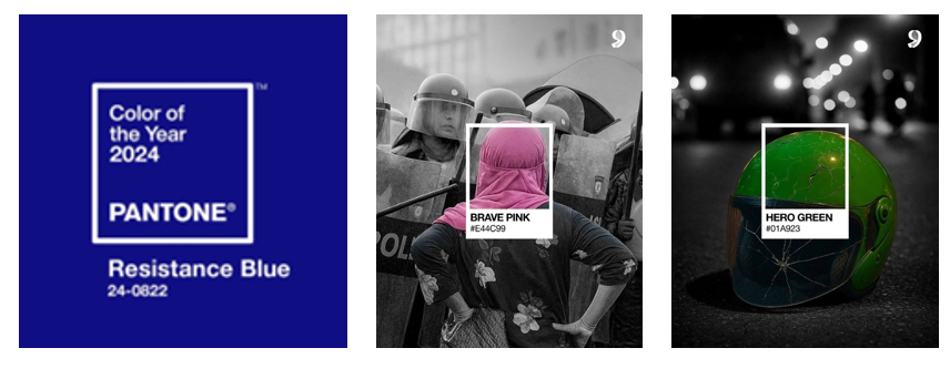 Kartu warna Pantone, yang digambarkan melalui beberapa ikon pergerakan. Dari kiri: resistance blue (sumber X. com/Eko Nugroho), brave pink (sumber: liputan6.com), dan hero green (sumber: liputan6.com)