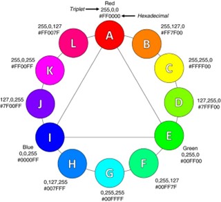 Kategori 12 rona warna (dalam format RGB) disertai notasi (sumber: https://pmc.ncbi.nlm.nih.gov/articles/PMC7040535/figure/rth212308-fig-0001/).
