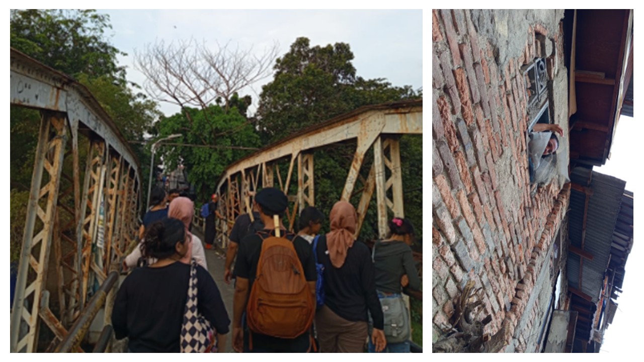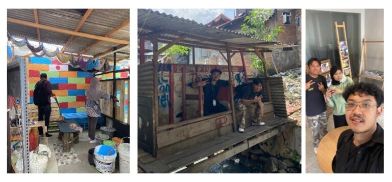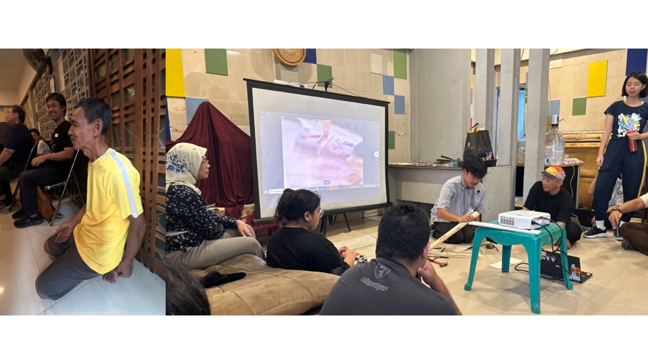 Tidak puas hanya melihat poster, kami juga berkeliling kampung, berkenalan dengan orang-orang baru sesama pengunjung, ditemani Mone, teman-teman dari Kampung Kolektief, dan Daichi-san, menyapa warga. Kami berkunjung ke bangunan sederhana yang sering dimanfaatkan sebagai area baca bagi anak-anak. Di sana terlihat hasiil eksplorasi dan kolaborasi warga dengan para akademisi; mengecat, memadu padankan warna, menyusun untaian kain-kain bekas menjadi bagian ceiling, bench yang dirangkai dengan besi siku, ditutup kawat besi lalu diisi dengan puing bekas bongkaran rumah, lalu bagian atasnya dipadu dengan keramik sebagai area duduk. Ini merupakan contoh konkret dari daur ulang dan keberlanjutan dalam desain melalui bangunan yang berfungsi sebagai ruang komunal dan membuktikan bahwa bahan sisa dapat diubah menjadi ruang yang baik secara visual dan bermakna untuk interaksi sosial.