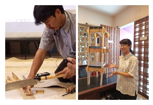 Daichi-san (kiri) sedang mempraktikkan teknik memotong kayu a la Jepang. Mone (kanan) dan bangku-bangku hasil lokakarya.