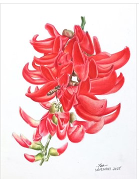 Gambar dibawah ini merupakan contoh karya dari Yuliana Susi, bunga Mucuna Bennettii atau disebut juga Irian Flame flower. Bungan ini Digambar dengan menggunakan teknik rendering pinsil warna.