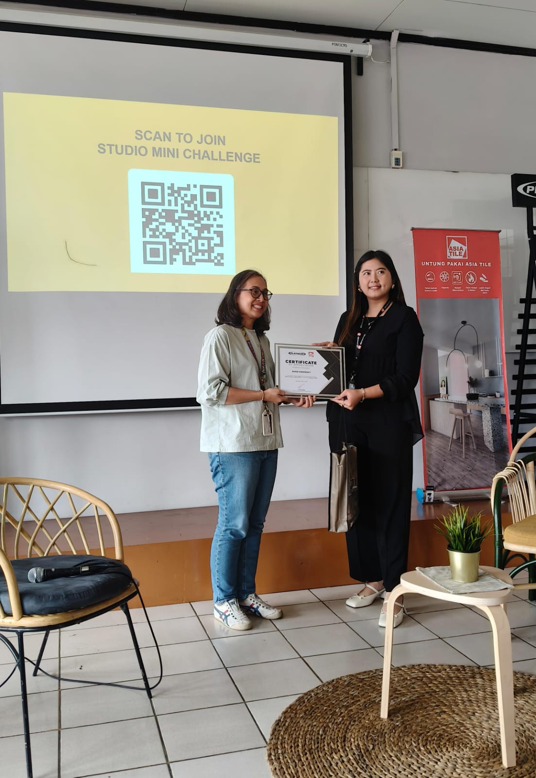 Gambar 2. Penyerahan sertifikat diwakili oleh Ibu Anak Agung Ayu Wulandari M.A (Ketua Jurusan Desain Interior BINUS University Jakarta)