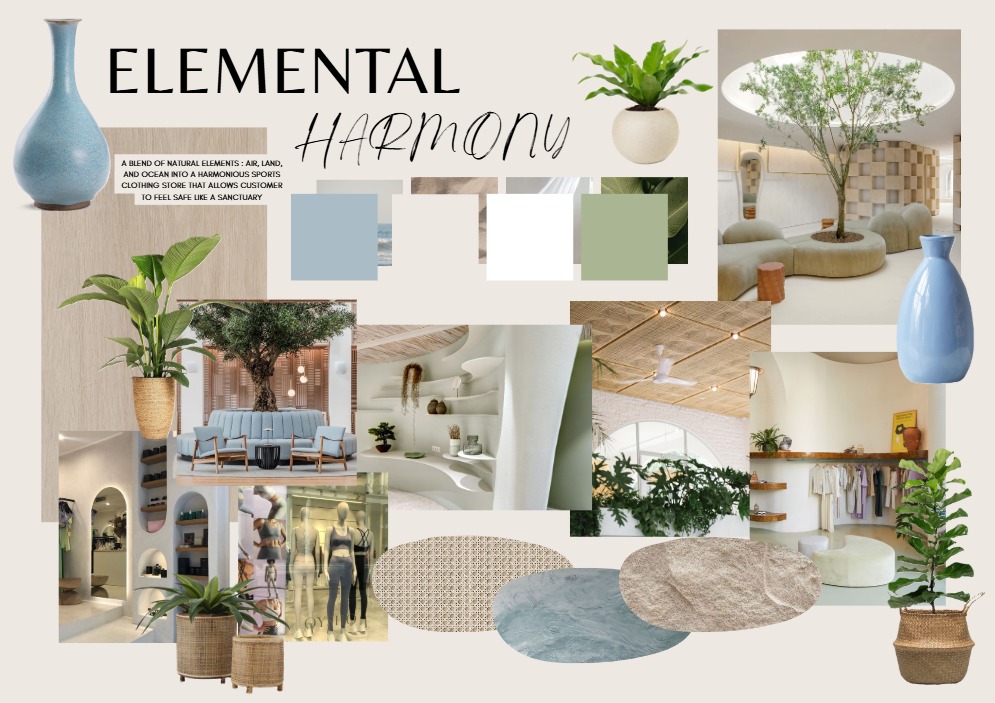 Konsep untuk ALO (Air. Land. Ocean) retail store yang bertujuan untuk memberikan rasa aman seperti “Sanctuary” dengan mengambil inspirasi dari tiga elemen utamanya yaitu udara, tanah, dan air (air, land, dan ocean). Menggabungkan sisi wellness dengan elemen alam menggunakan color palette muted blue, sage green, dan warm beige. Dan menggunakan material rotan, kayu, aksen natural batu, menempatkan tanaman-tanaman dan elemen design lengkungan-lengkungan organik. Bukan hanya toko pakaian olahraga, tapi juga meningkatkan well-being pelanggan secara emosional lewat suasana yang harmonis dan menenangkan.