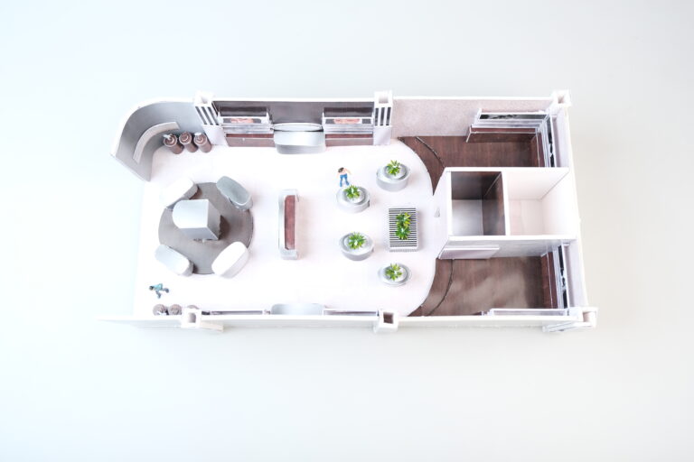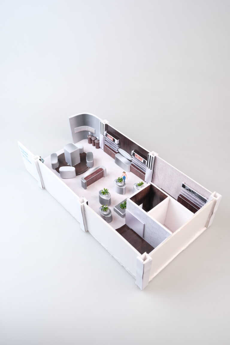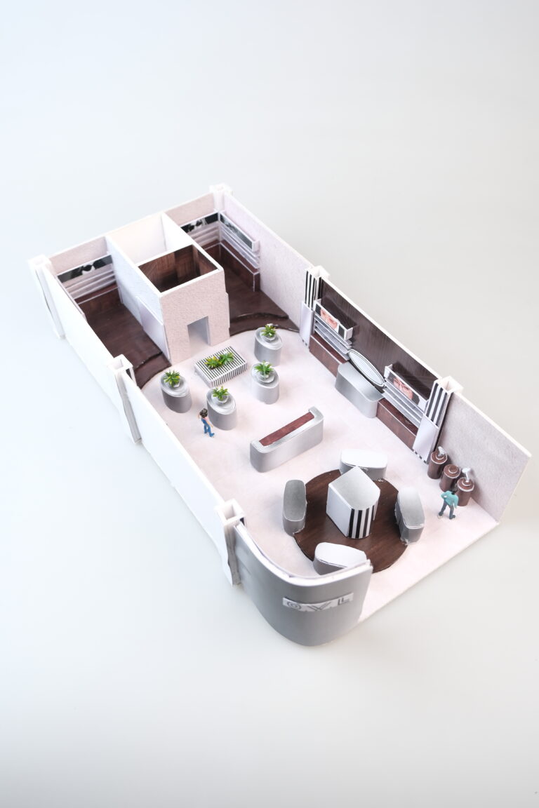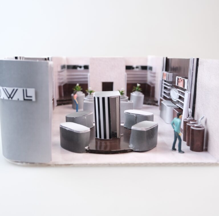Konsep retail O.W.L ini berasal dari eksplorasi identitas visual brand, terutama elemen garis pada logo yang diterapkan ke dalam desain interior untuk membentuk ritme visual pada dinding dan display. Palet warna hitam, putih, abu, dan silver digunakan untuk menghadirkan kesan modern, minimal, dan industrial, yang kemudian dipadukan dengan aksen kayu agar ruang terasa lebih hangat dan seimbang. Selain itu, terdapat fitur interactive screen yang memungkinkan konsumen mencoba kacamata secara virtual, serta area photobooth di bagian depan toko untuk mendukung interaksi dan memberikan pengalaman yang lebih engaging bagi para pelanggan.